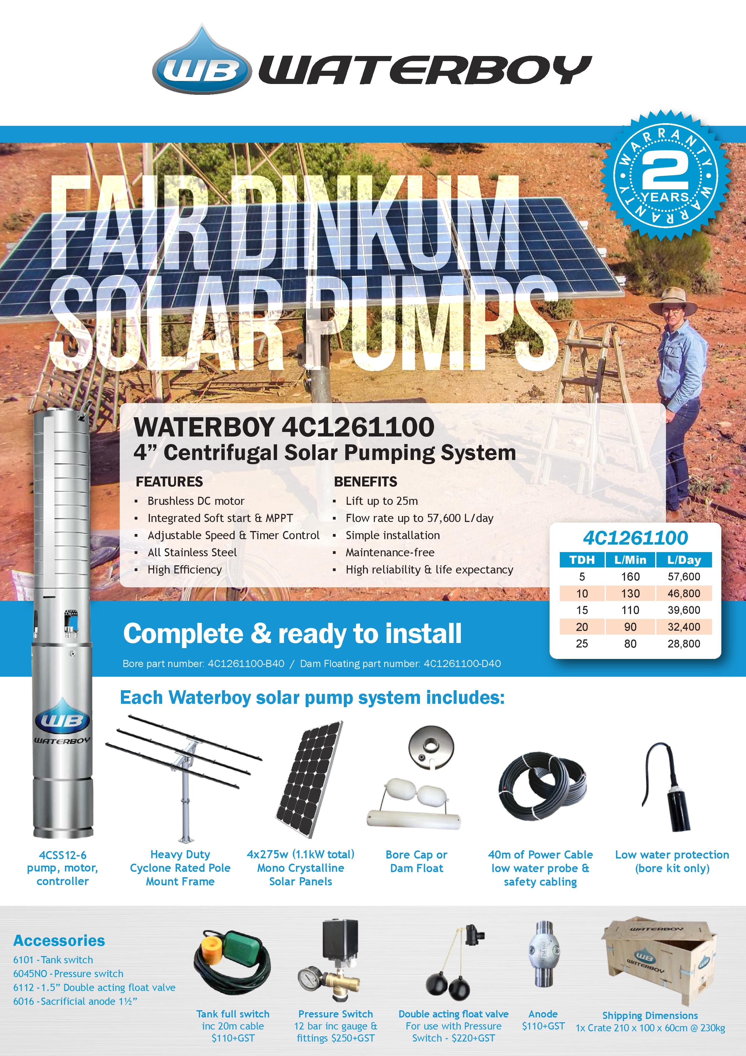 Our Waterboy 4C1261100 is our a mid to high range 4" Centrifugal (C) solar submersible pumping system. It is a good solution for medium to high water supply solutions where there is minimal lift (below 25m) and where a higher volume of water is required. This pump will give you between 28,800 – 57,600 L of water per day (based on 6 hours of sunlight).