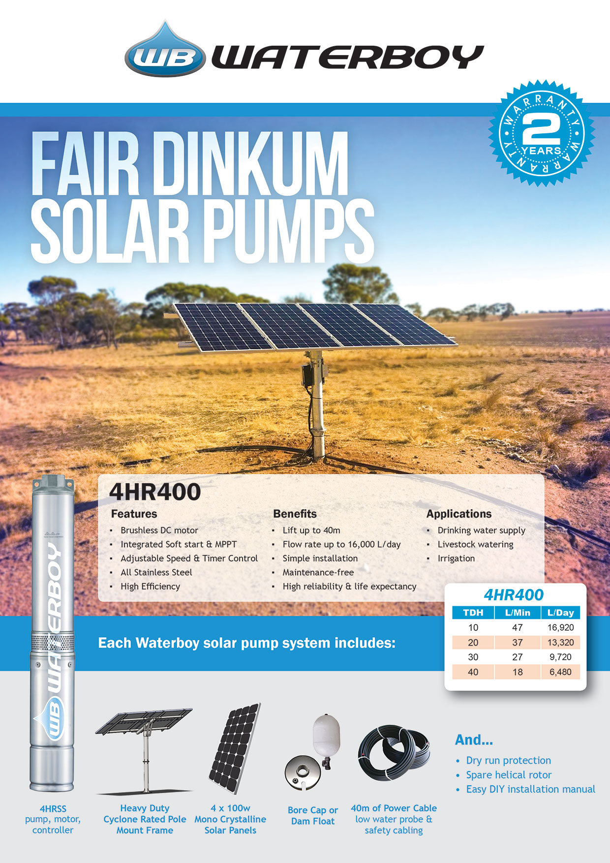 Our Waterboy 4HR400 is our smallest 4" Helical Rotor (HR) solar submersible pumping system and is perfect for mid range water supply solutions where there is up to 40m of lift. This pump will give you between 6,400 - 16,920L of water per day (based on 6 hours of sunlight).