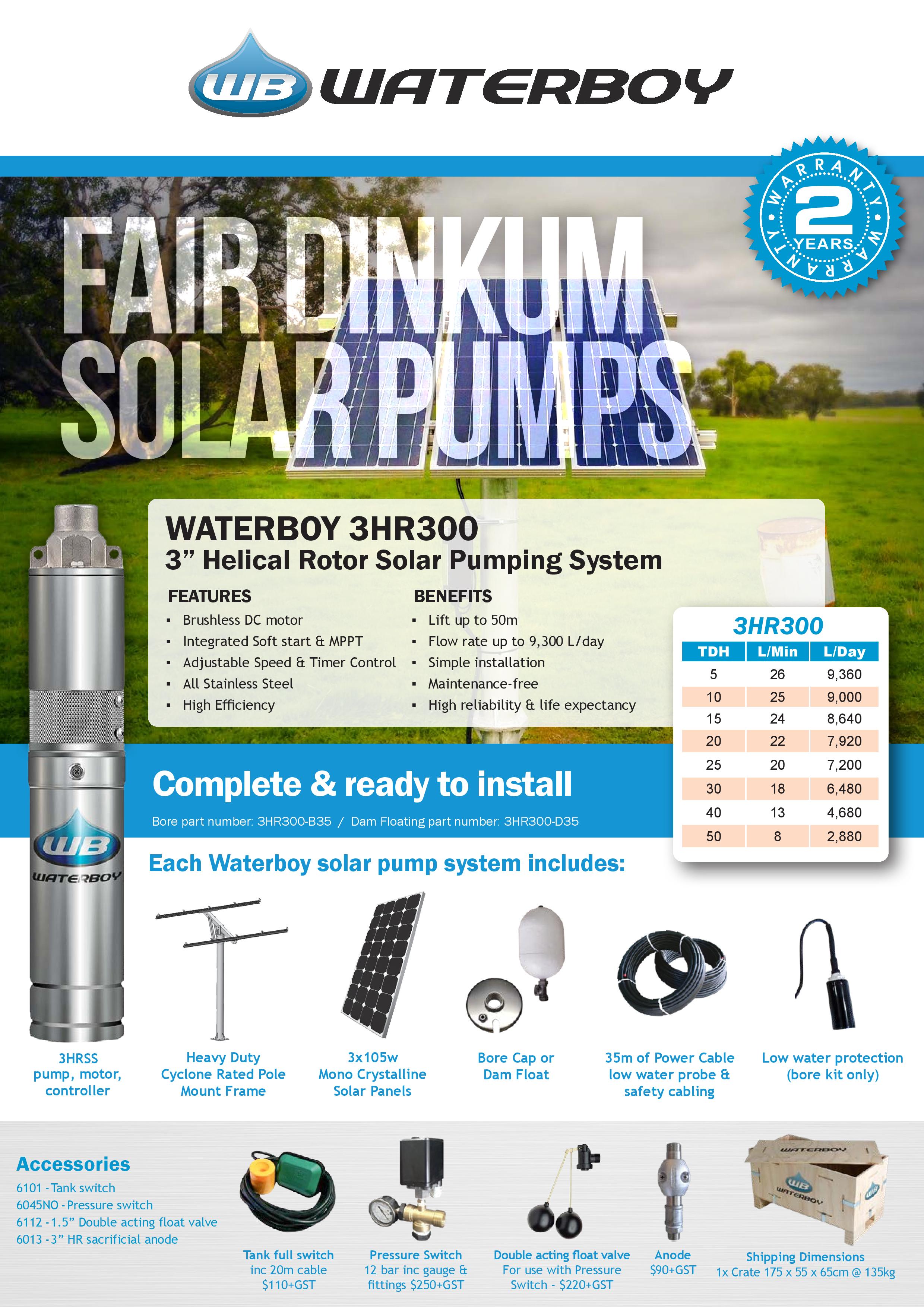 Waterboy 3HR300 is a more powerful version of our 3HR200 system with extra lift capacity, putting it in our mid range Waterboy. With its range of pumping options varying from 0 - 50 TDH you can expect to receive approximately 2,800 - 9,300L per day. Suited for small to mid range water supply solutions.