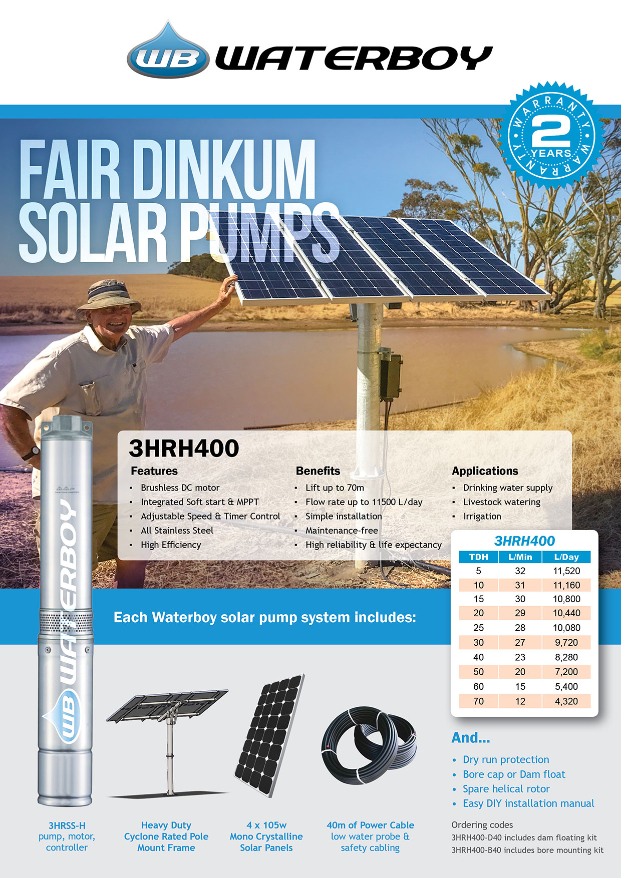 Our Waterboy 3HRH400 is our largest 3" Helical Rotor (HR) solar pumping system and is designed for water supply solutions ranging from 4000 - 11,500 L per day depending on the TDH (0-70m).
