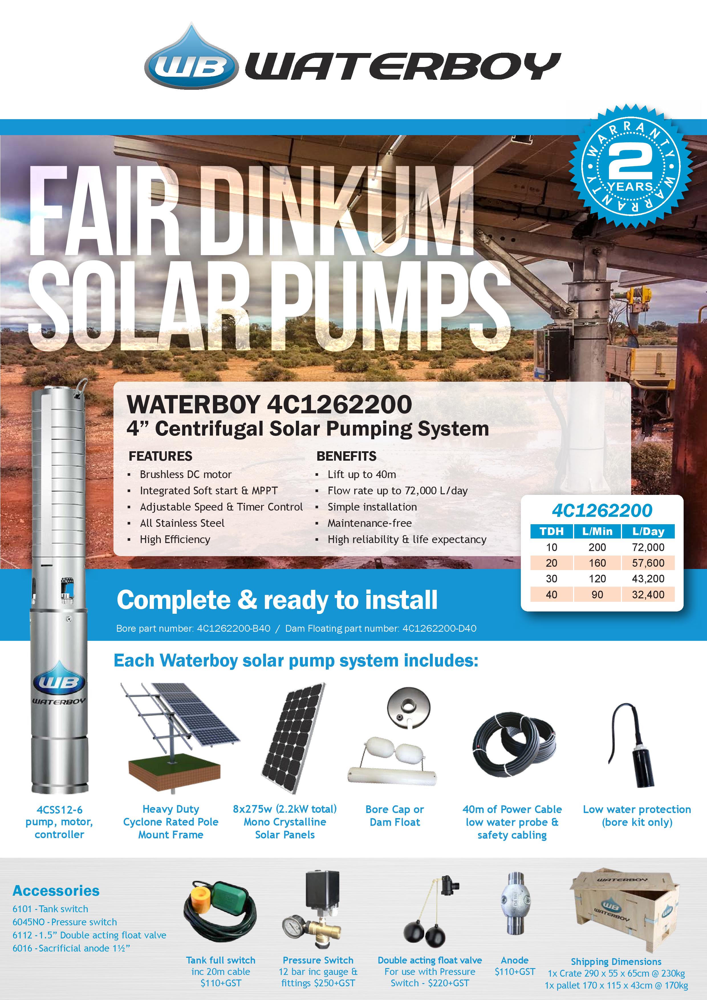 Our Waterboy 4C1262200 is our a high range 4" Centrifugal (C) solar submersible pumping system. It is a good solution for high water supply solutions where there is minimal lift (below 40m) and where a higher volume of water is required. This pump will give you between 36,000 – 72,000 L of water per day (based on 6 hours of sunlight).