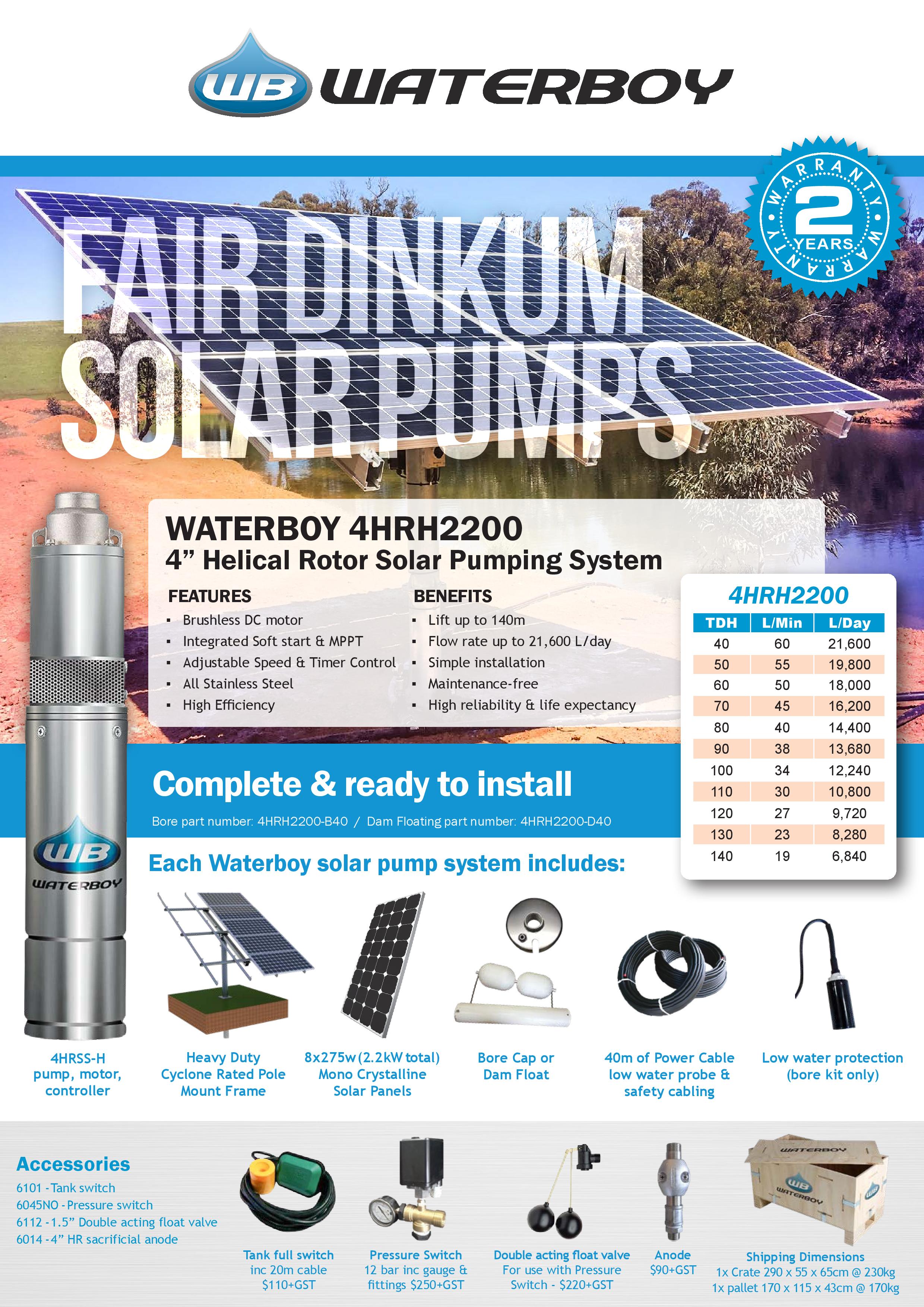 Our Waterboy 4HRH2200 is our largest 4" Helical Rotor (HR) solar submersible pumping system that require a very large amount of lift (up to 140m) and is perfect for mid to large range water supply solutions. This pump will give you between 6,840 – 21,960L of water per day (based on 6 hours of sunlight).