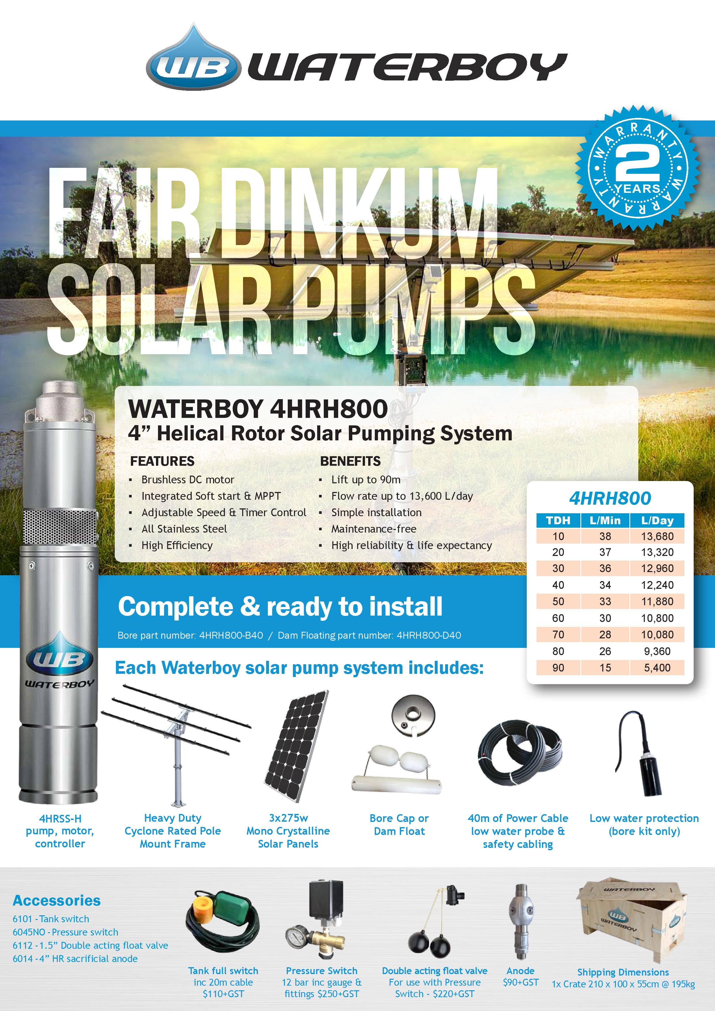 Our Waterboy 4HRH800 is our mid range 4" Helical Rotor (HR) solar submersible pumping system that require a large amount of lift (up to 80m) and is perfect for mid range water supply solutions. This pump will give you between 9,320 - 14,4000 L of water per day (based on 6 hours of sunlight).